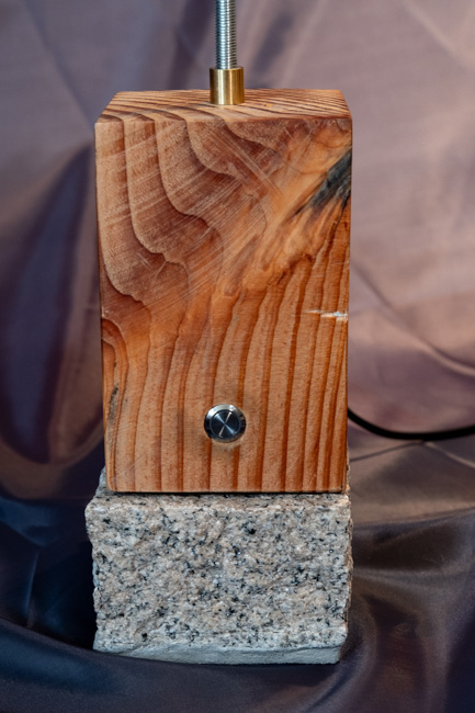 Ein hohes und schmales Objekt aus einem hölzernen Fuß auf einem Granitsockel, einem hohen und schlanken Gewinderohr 8 mm, einem umgebauten und angepassten Bunsenbrenner,einem Flexrohr mit 5.1 Aufnahme für eine LED 12 V. Als besonderes Dekolement sind Federn verwendet.
